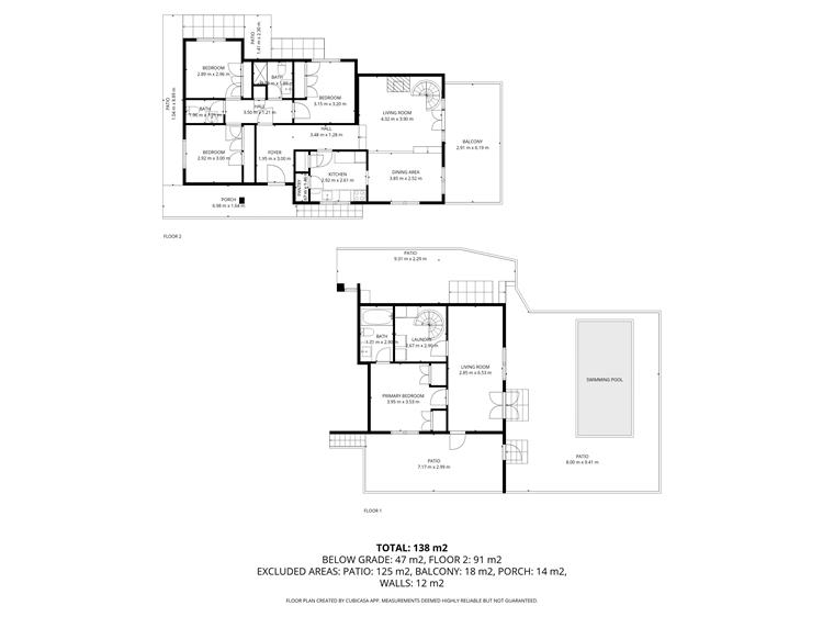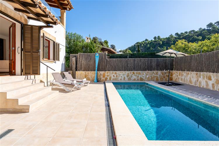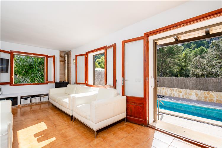 Built on a spacious plot of 360m2, this villa offers plenty of space for outdoor dining, or relaxing by the pool. The main living space is located on the ground floor, with a corridor leading to three large bedrooms and two bathrooms. The modern kitchen is well equipped with small storage / pantry. The living room opens up on to a large balcony / terrace with ample space for dining while soaking in the stunning surrounding mountain views. The spiral staircase leads down to a guest apartment space, consisting of laundry area,, the fourth bedroom, with en-suite, and a second living room, which leads out to the pool area. The side of the house offers a driveway with covered porch for off road parking For winter living, the property has a log burner on each floor, and for those not brave enough for winter swimming, the pool is also heated. This property is ideal for all year round living, or perfect for a peaceful holiday retreat in one of the most pictureque parts of Mallorca