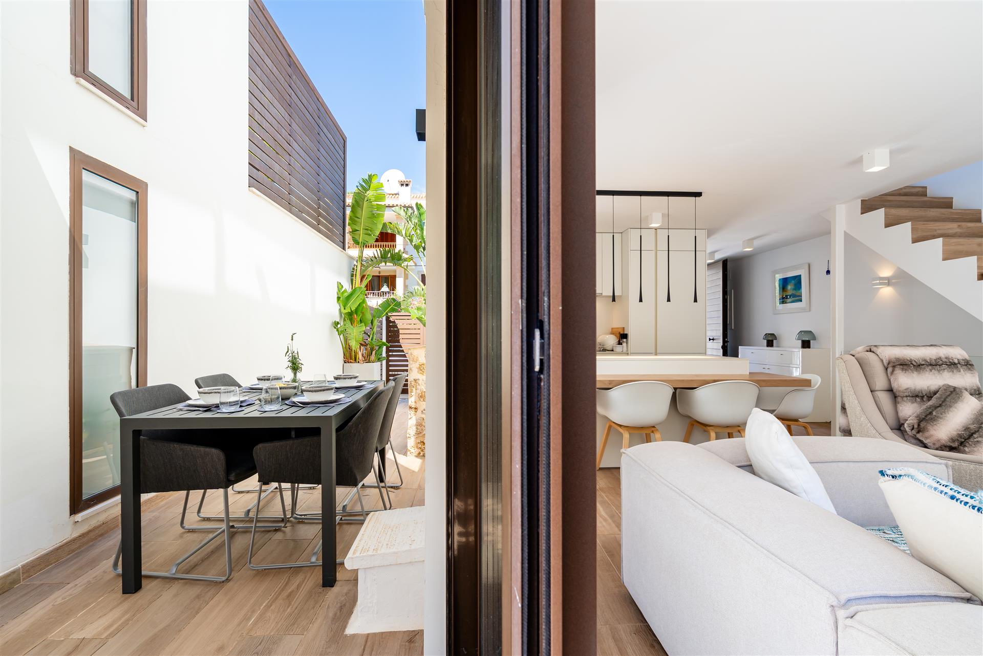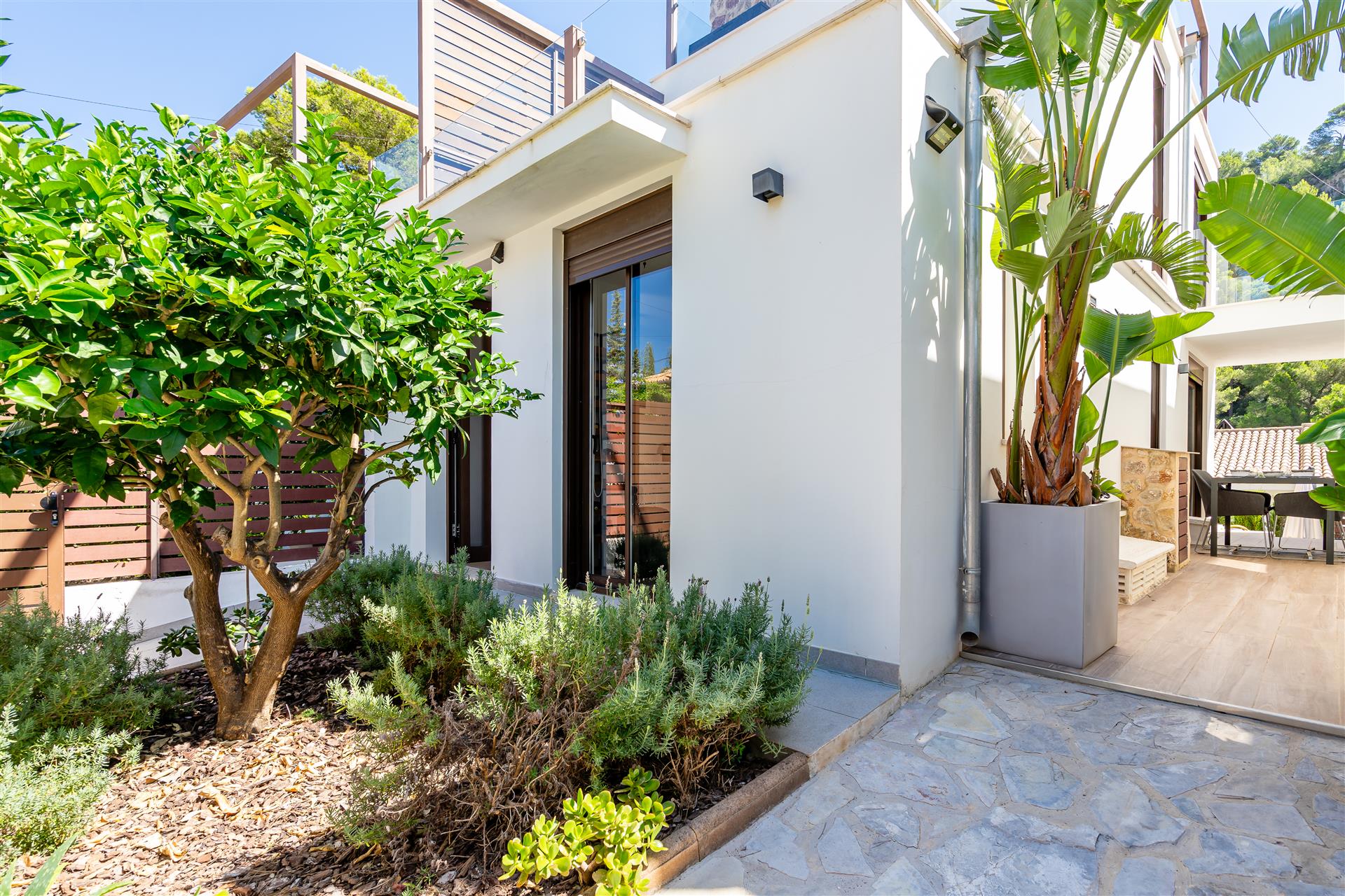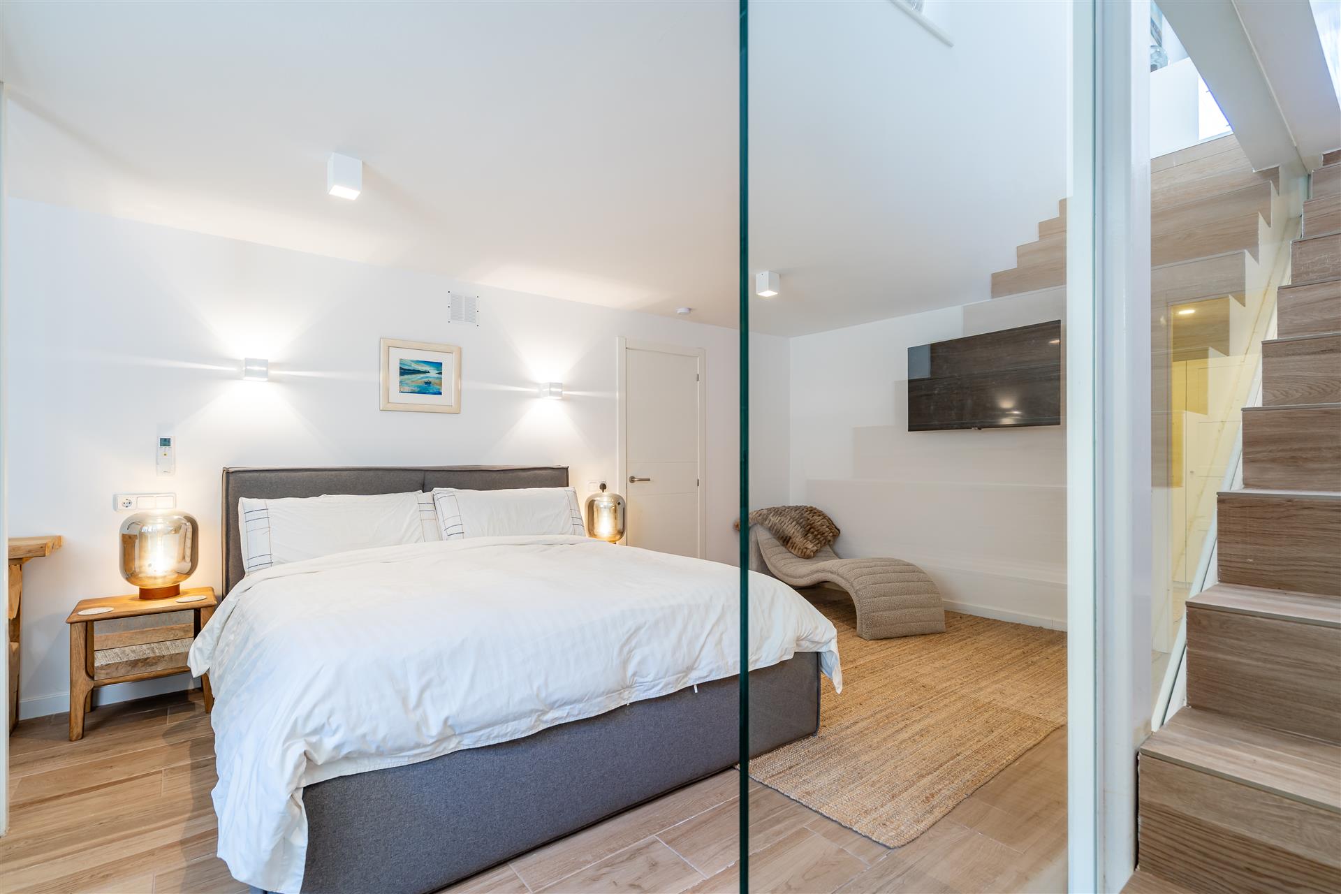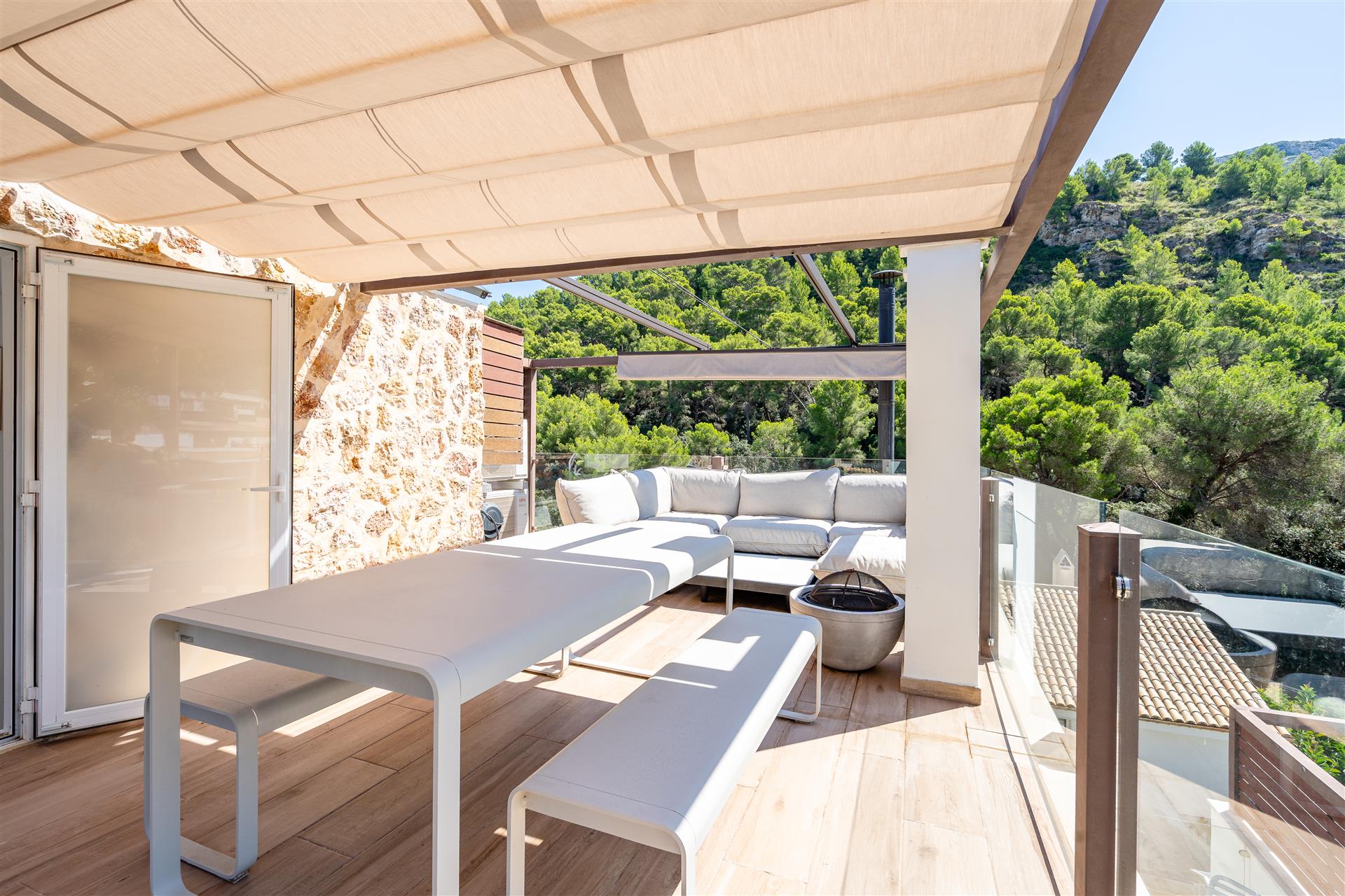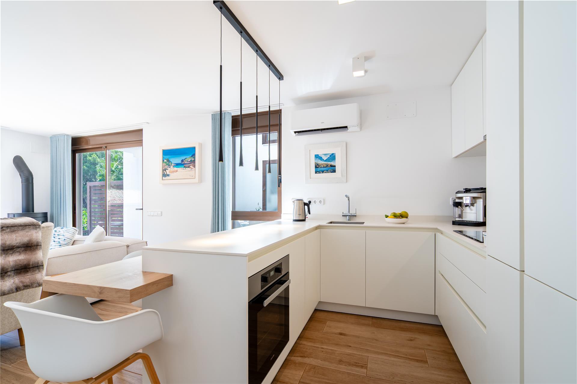 This property was built in 2020 and has been finished to an exceptional standard, ensuring a luxurious and inviting living space. Spread across three levels, the house boasts a well-designed layout that prioritizes both privacy and functionality. At the basement level, you will find a master bedroom with its own modern bathroom, providing a private and comfortable area to relax. There is also a separate laundry room and more than adequate storage space. Adjoining this bedroom is a spacious dressing room, currently used as an office. The ground floor welcomes you with an open plan living room opening out to a terrace with lovely views towards the quiet private pool, perfect for cooling off during the warm summer months. While not overly large, the pool still offers a refreshing respite and adds to the overall enjoyment of the outdoor space. On the first floor, you will find two spacious double bedrooms with a shared bathroom. Both bedrooms are equipped with fitted wardrobes and have a direct access to the terrace which is perfect for bringing the outside in and giving beautiful views from every room. The stand-out feature of this apartment is the stunning, 30sqm+ roof terrace boasting panoramic views of Cala San Vicente. The terrace is also equipped with a barbecue area and comfortable seating, making it an ideal spot for outdoor dining or relaxing under the stars. Other features include air conditioning units in each room for climate control, a cozy log burner in the living room for a warm and inviting ambiance on cooler evenings, double glazed windows, and electric shutters throughout.