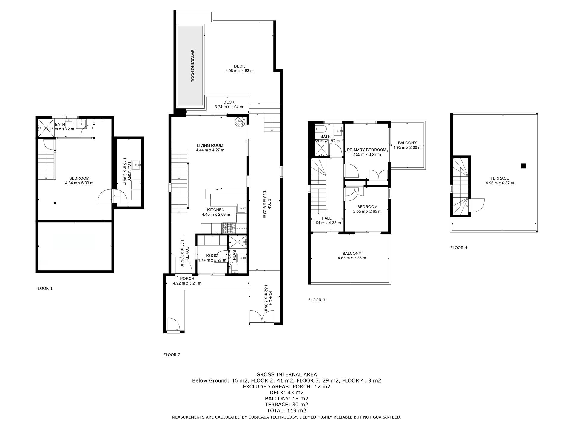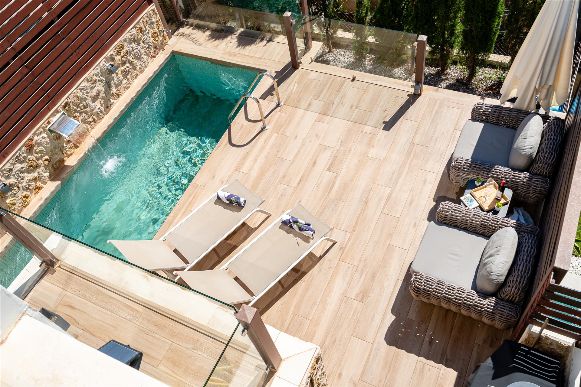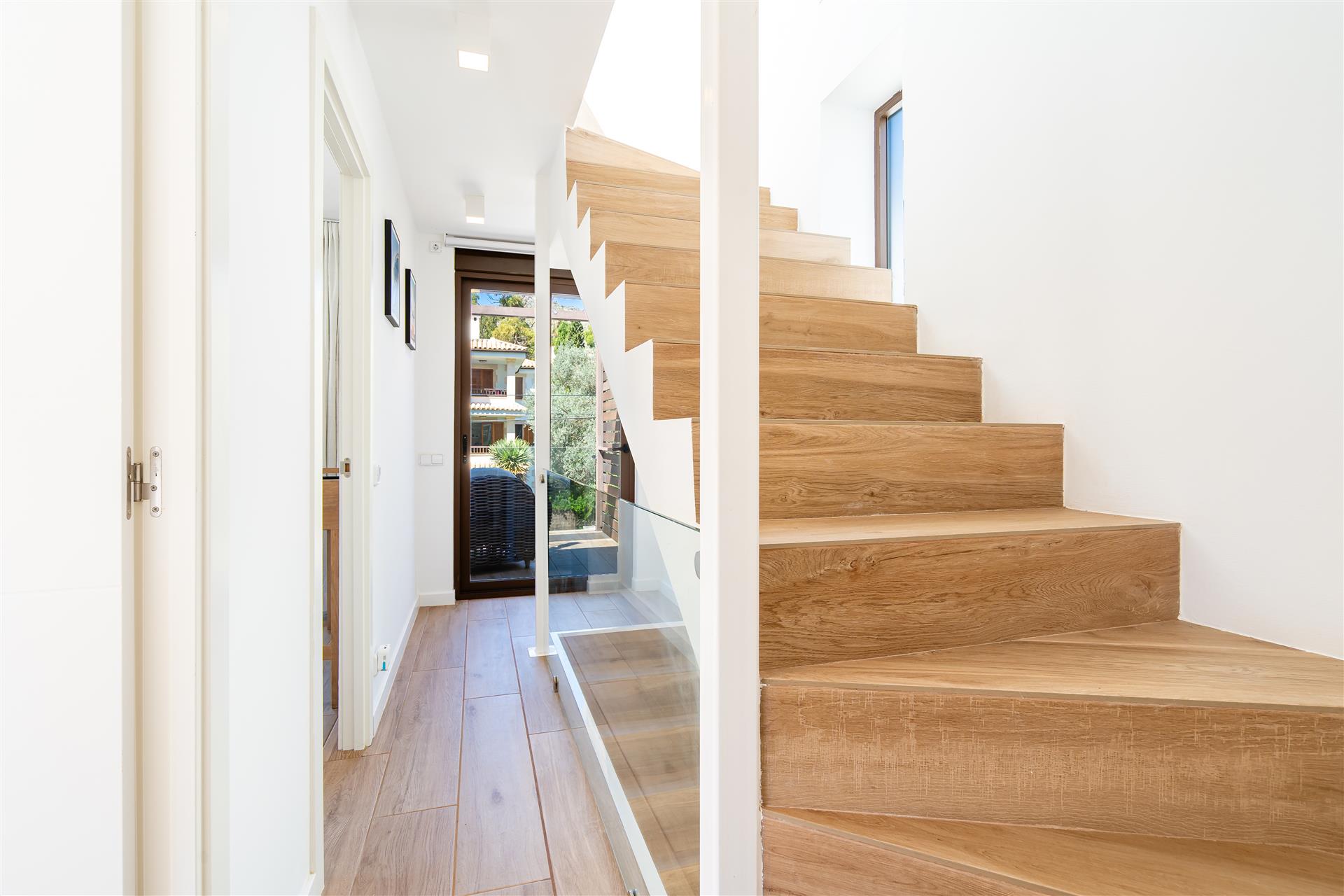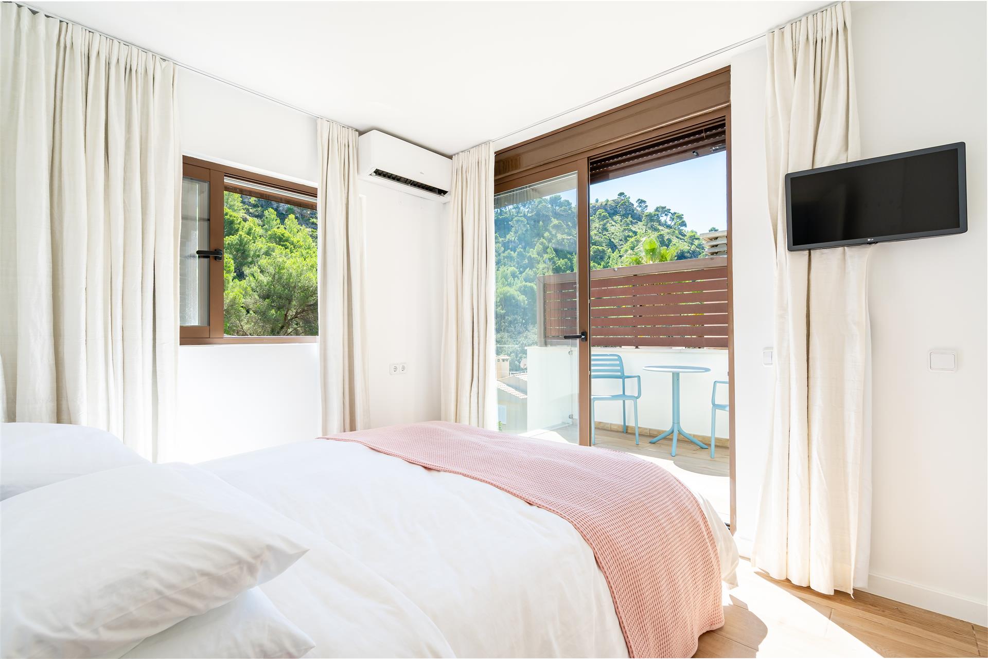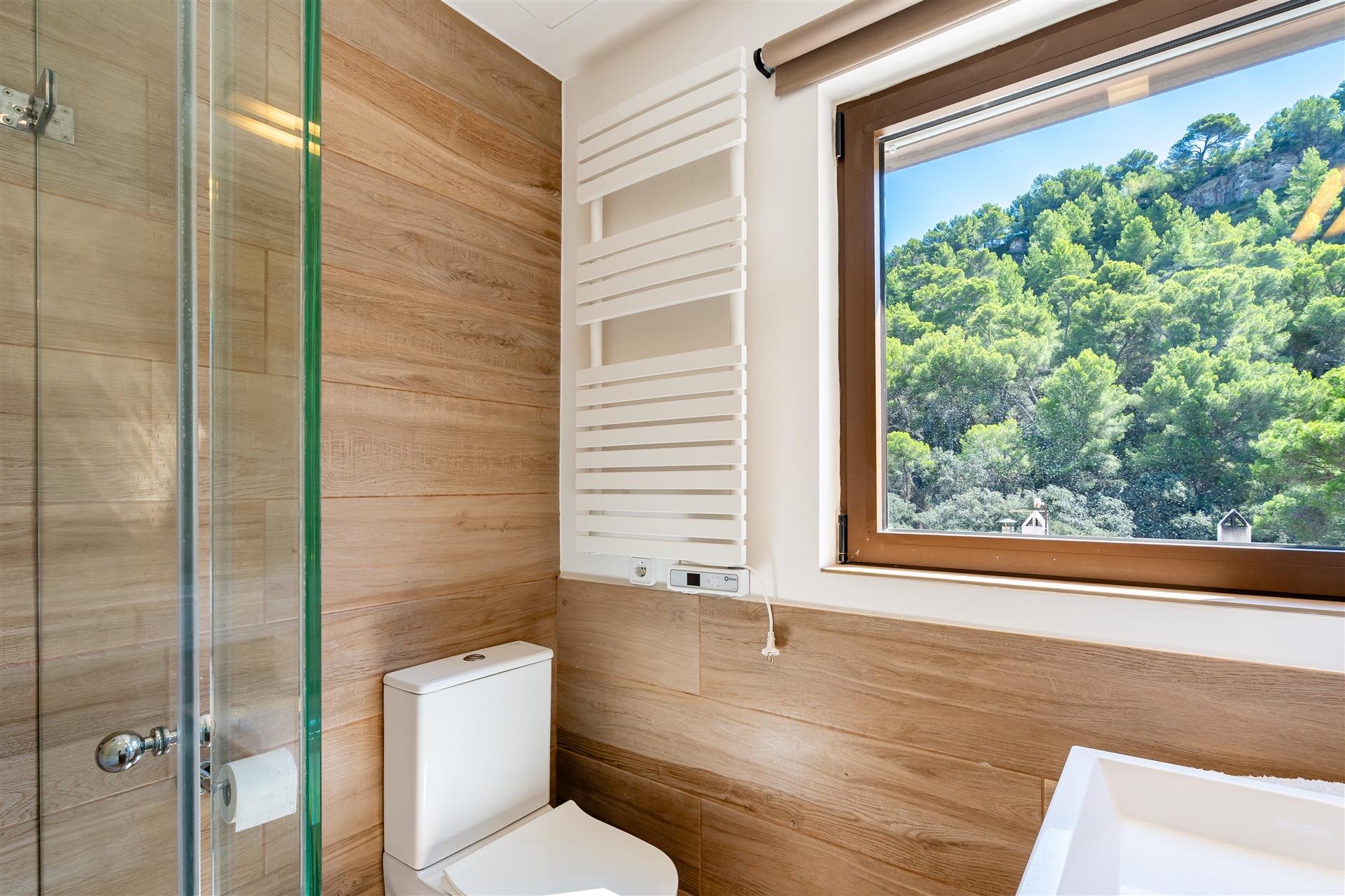 This property was built in 2020 and has been finished to an exceptional standard, ensuring a luxurious and inviting living space. Spread across three levels, the house boasts a well-designed layout that prioritizes both privacy and functionality. At the basement level, you will find a master bedroom with its own modern bathroom, providing a private and comfortable area to relax. There is also a separate laundry room and more than adequate storage space. Adjoining this bedroom is a spacious dressing room, currently used as an office. The ground floor welcomes you with an open plan living room opening out to a terrace with lovely views towards the quiet private pool, perfect for cooling off during the warm summer months. While not overly large, the pool still offers a refreshing respite and adds to the overall enjoyment of the outdoor space. On the first floor, you will find two spacious double bedrooms with a shared bathroom. Both bedrooms are equipped with fitted wardrobes and have a direct access to the terrace which is perfect for bringing the outside in and giving beautiful views from every room. The stand-out feature of this apartment is the stunning, 30sqm+ roof terrace boasting panoramic views of Cala San Vicente. The terrace is also equipped with a barbecue area and comfortable seating, making it an ideal spot for outdoor dining or relaxing under the stars. Other features include air conditioning units in each room for climate control, a cozy log burner in the living room for a warm and inviting ambiance on cooler evenings, double glazed windows, and electric shutters throughout.
